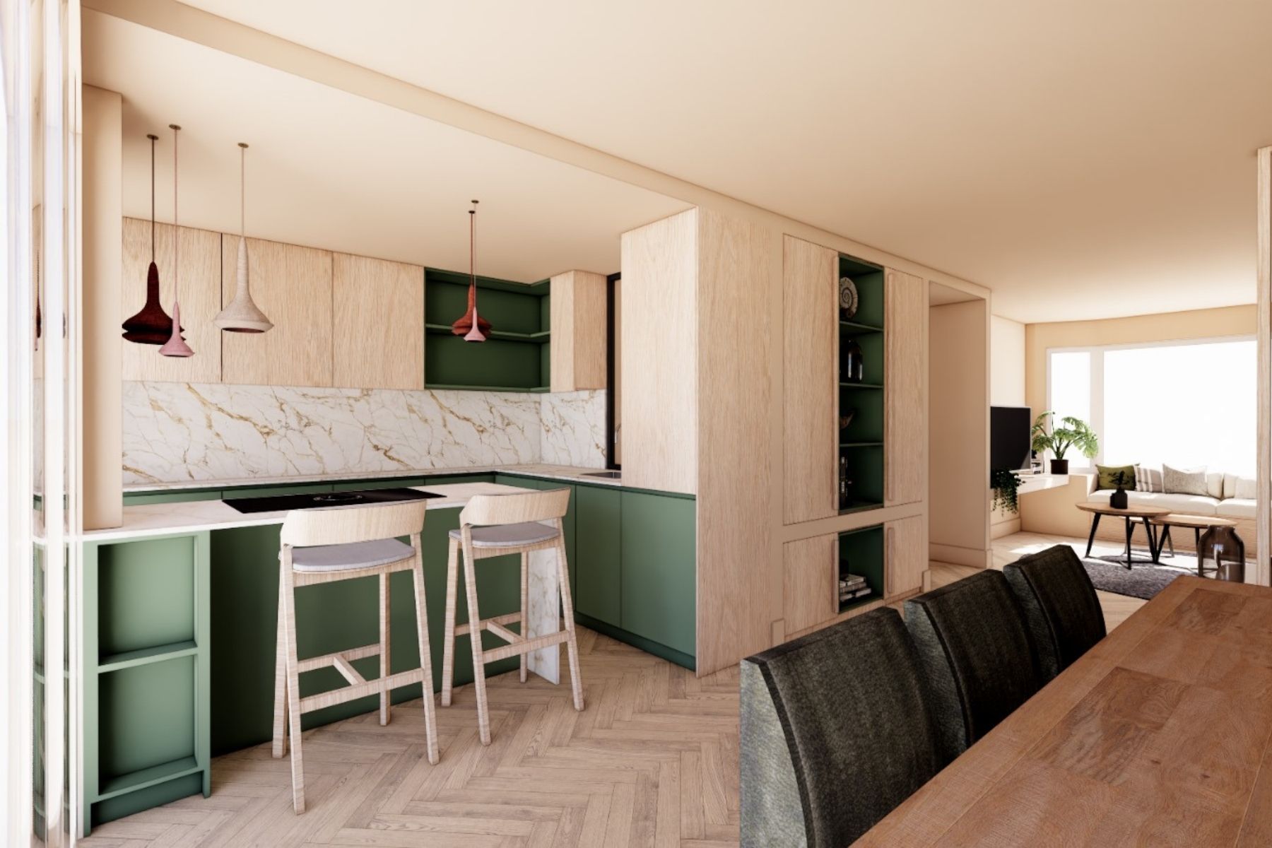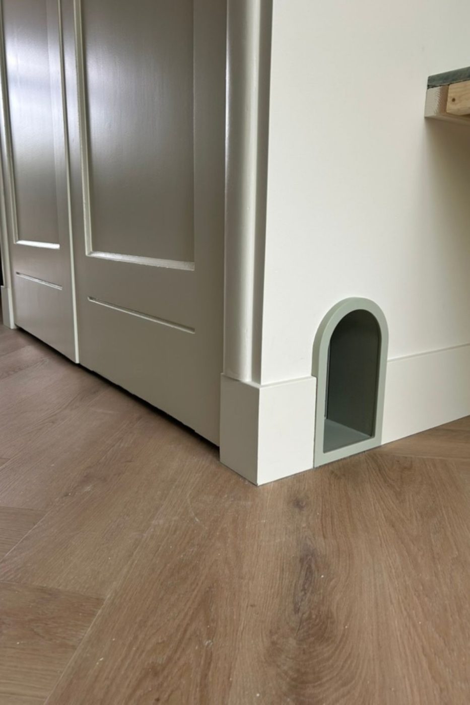 De wens van de bewoners: een interieur met een Scandinavische sfeer, waarin licht hout, natuurlijke groentinten en warme accenten de hoofdrol spelen. Het resultaat is een rustig en sfeervol geheel waarin functionaliteit en comfort samenkomen. Een speels detail mocht niet ontbreken: een op maat gemaakt kattenluikje in de muur, zorgvuldig geïntegreerd in het ontwerp.